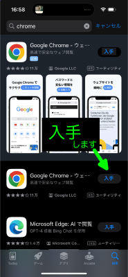 3. Google Chrome というアプリがリストアップされますので、「入手」します